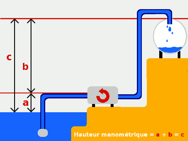 (c) La somme de ces deux hauteurs est appelée hauteur manométrique totale (HTM). En tenant compte des « pertes de charges », la HTM permet de déterminer le couple débit/pression de la pompe à eau dont vous avez besoin. Jusqu’à 50 mètres de hauteur manométrique, il faut majorer de 15%.