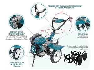Le panneau de commande ergonomique permet un contrôle rapide et une manœuvre facile du motoculteur. Les poignées peuvent être réglées verticalement à 180° et horizontalement à 360°, ce qui permet d’ajuster le motoculteur pour tout type d’utilisateur, facilite la manipulation et rend l’appareil plus compact pour stockage. Le motoculteur est équipé d’un coffre à outils pour une utilisation plus pratique.