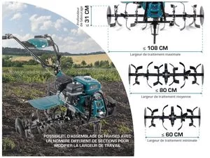 Avec une largeur de travail de 108 cm et une profondeur de 35 cm, il est idéal pour les grandes surfaces. Le réservoir de carburant de 3,6 litres et le carter d’huile de 0,6 litre permettent une autonomie suffisante pour les travaux intensifs. La transmission axiale conique et la boîte de vitesses à multiples rapports offrent une excellente polyvalence, y compris la marche arrière.