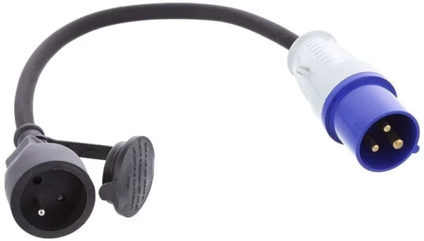 L’adaptateur pour prise industrielle permet le branchement d’appareil domestique 230V 10/16 A sur la prise industrielle. Adaptateur prise industrielle/ prise domestique NF. Composé de 2P + T domestique femelle et 2P + T mâle industrielle 16A SDMO. Cable de 30 cm.