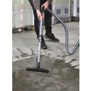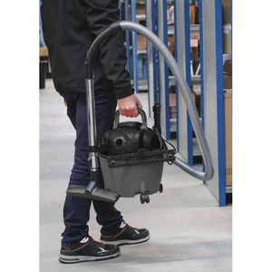 Aspirateur eaux et poussières qui possède 1 moteurs de 1200W, une cuve fixe en PVC et 4 roues pivotante.