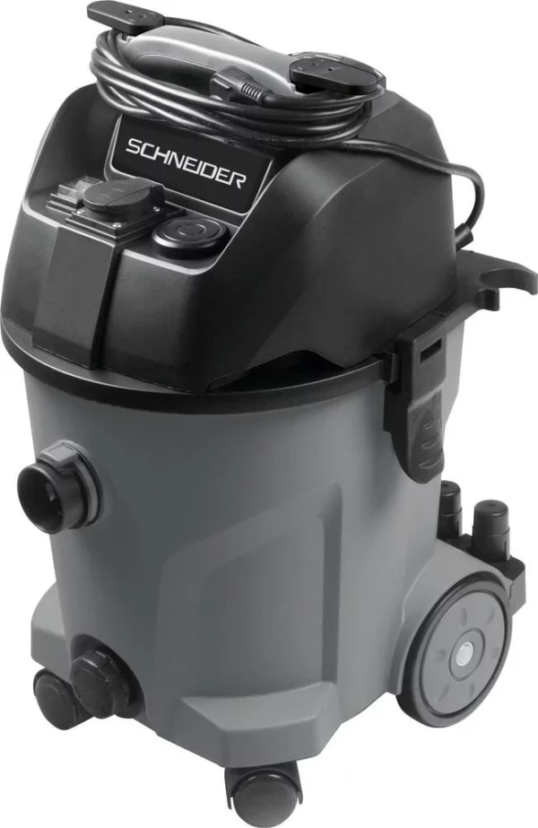 Aspirateur eau et poussière Schneider avec support de rangement pratique avec poignée intégrée et roues larges pour une stabilité optimale. Indicateur de remplissage de cuve et système de décolmatage inclus pour une utilisation aisée. Puissance maximale de 2000W, classe 1, avec prise asservissement pour une performance fiable.