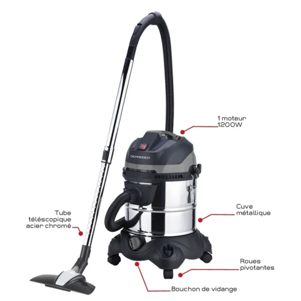 Son moteur de 1200W garantit une aspiration optimale. Vous pouvez l’utiliser pour nettoyer les débris secs, mais aussi pour aspirer l’eau sans effort. De plus, cet aspirateur est équipé d’un filtre lavable qui facilite l’entretien et améliore la qualité de l’air.