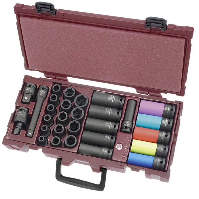 Assortiment 29 pièces dans valise. Jeu comprenant: 15 douilles industrielles à six pans (8 – 9 – 10 – 11 – 12 – 13 – 14 – 15 – 16 – 17 – 18 – 19 – 21 – 22 – 24mm) 6 douilles industrielles à six pans longues (14 – 17 – 19 – 21 – 22 – 24mm) 5 douilles industrielles longues avec protection (17 – 19 – 21 – 22 – 24mm) 1 rallonge de 125mm 1 pièce de réduction de 1/2″ carré intérieur à 3/4″ carré extérieur 1 articulation à cardan Matériau: Chrome molybdène Taille de l’entraînement: 0.5 inch Dimensions: [421 x 200 x 68] mm Poids: 6.95 kg