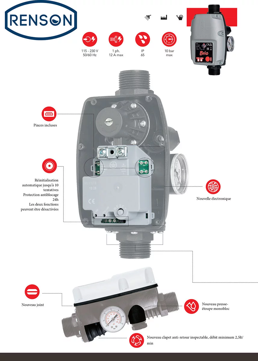 Appareil de contrôle de pression et de débit, connecté à un système électronique, éliminant les inconvénients des systèmes mécaniques traditionnels. Il protège contre le fonctionnement à sec, peut être installé verticalement ou horizontalement.