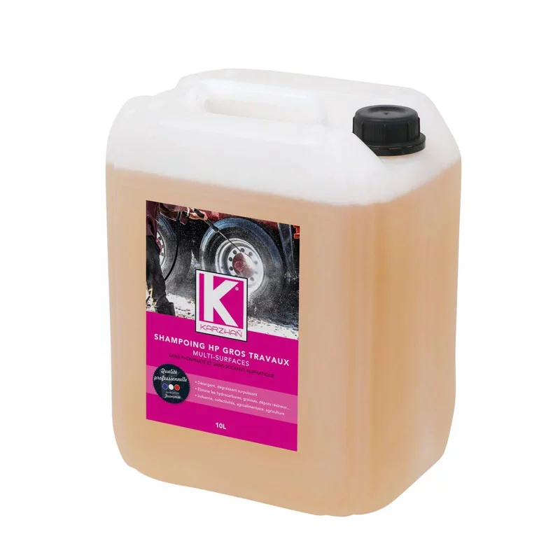 Shampoing concentré gros travaux spécial HP. Puissant nettoyant formulé pour les hautes pressions, idéal pour éliminer la saleté tenace sur les surfaces difficiles.