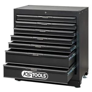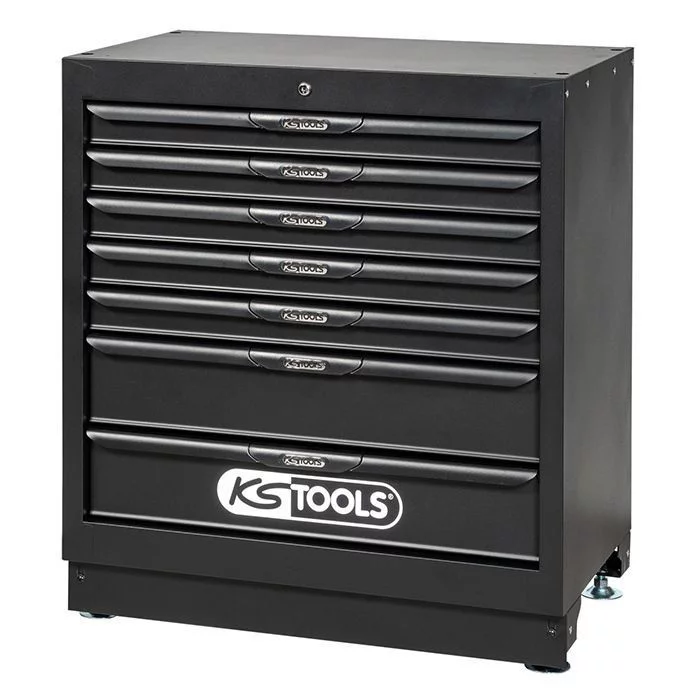 Bloc servante de 7 tiroirs KS TOOLS. Ce bloc est équipé d’un système de fermeture centralisé par serrure, et de pieds réglables.