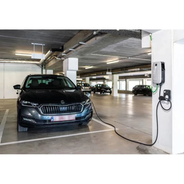 Borne de recharge pour véhicule électrique. Un design attrayant cette borne est équipée d’un câble extrêmement flexible d’une longueur de 5 mètres, d’un affichage LED dynamique, et d’une fixation murale. Livrée sans pied.