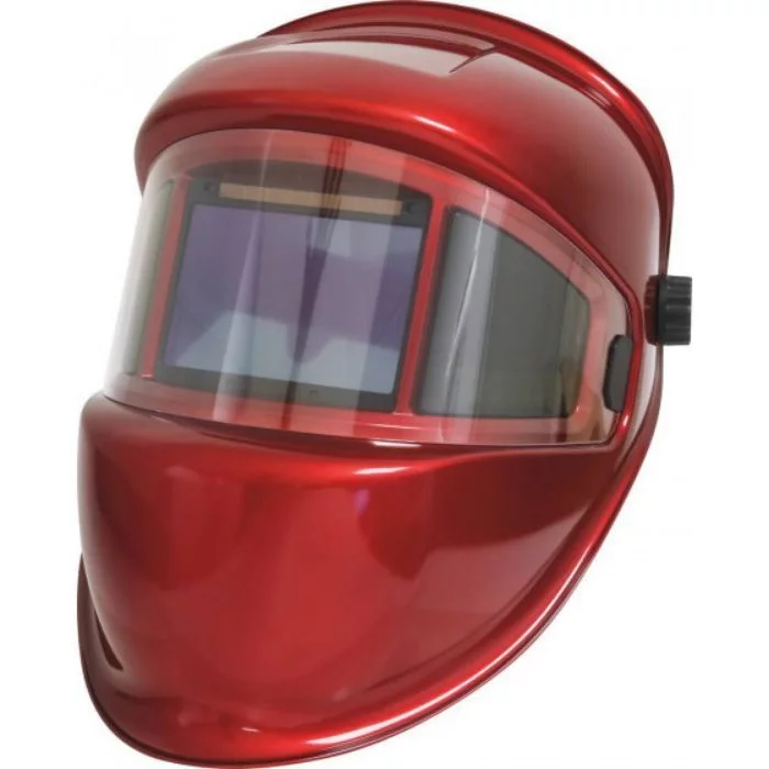 Cagoule de soudage automatique teinte 5/9-9/13 vision 100. Cagoule de soudage munie de sa magnifique couleur rouge est son champ de vision de côté.