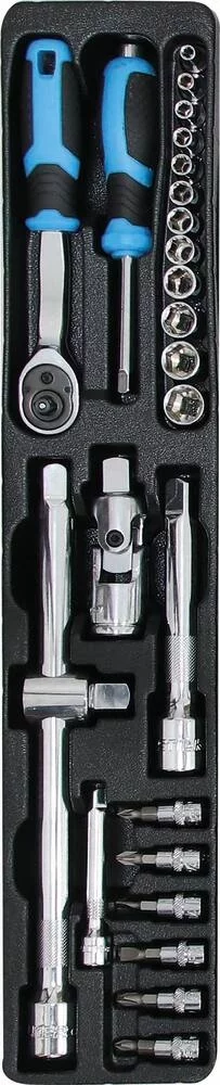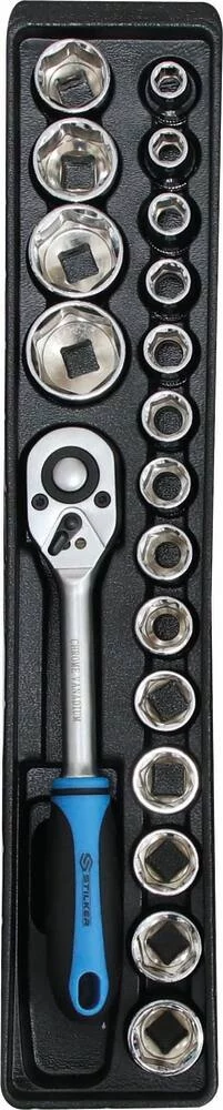 – 18 douilles 1/2″ : 10-11-12-13-14-15-16-17-18-19-20-21-22-23-24-27-30-32 mm