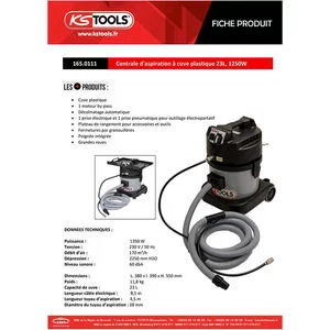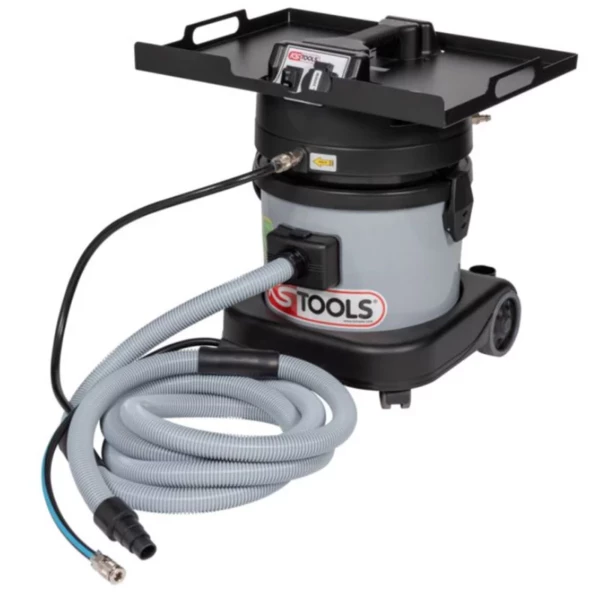 Centrale d’aspiration KS TOOLS à cuve plastique 23 Litres avec un Flexible de 4,5 mètres et un plateau Central.