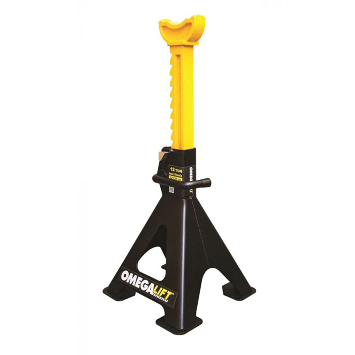 Chandelles à crémaillères OMEGA de capacité 12 tonnes. Ces chandelles sont vendues par paire et sont destinées au levage de véhicules et engins Poids Lourds. Des broches de sécurité supplémentaire et plaques soudées sous les pattes pour plus de stabilité.