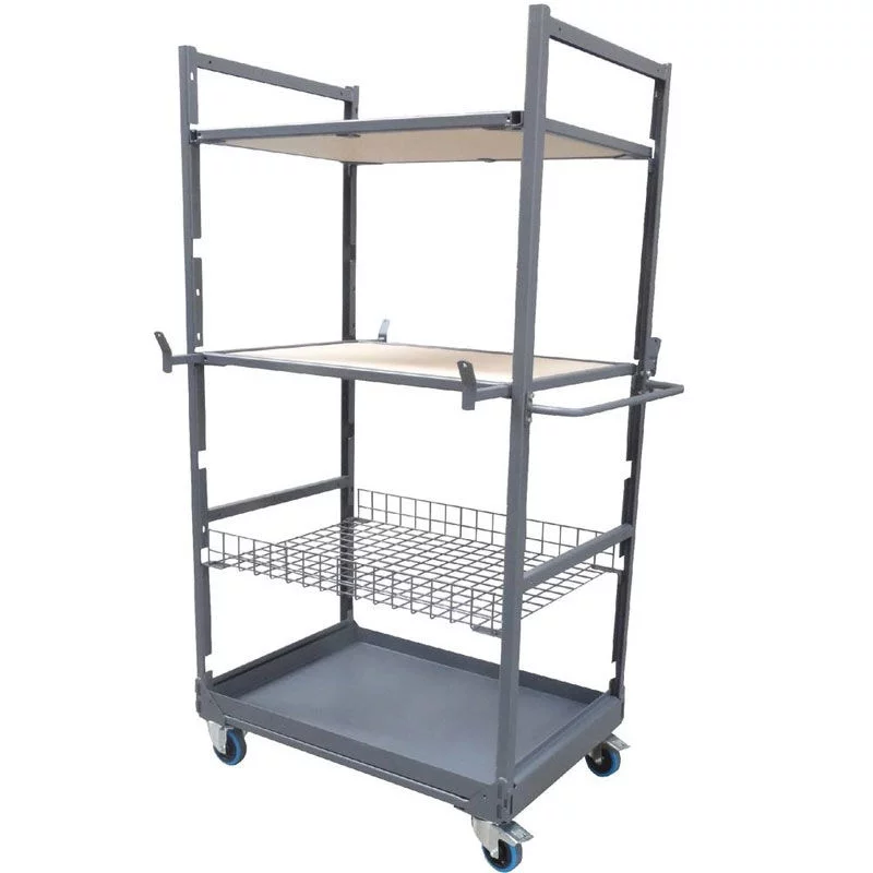 Chariot de maintenance modulable de fabrication Française, cadre en acier monté sur 4 roulettes, dont 2 pivotantes avec freins. Équipé d’un bac de rétention, 2 plateaux bois hauteur modulable d’une capacité de 100 kg, 1 grille hauteur modulable, 1 poignée pour manœuvrer. Chariot livré non monté.