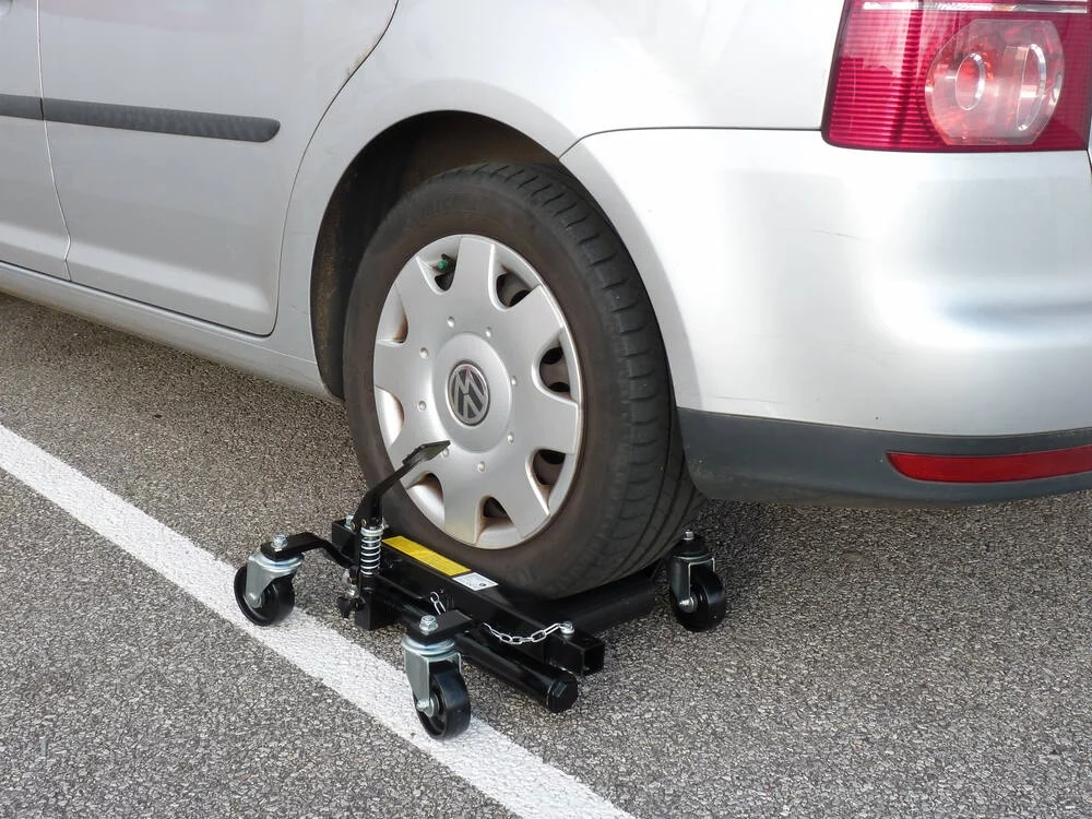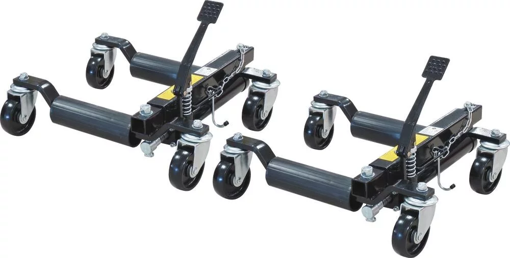 Chariot de manutention Type GOJAK Facilite le déplacement des véhicules dans les zones encombrées. Les deux rouleaux se positionnent de part et d’autre du pneumatique et décollent celui-ci du sol sans aucun risque. Ces chariots permettent de faire pivoter un véhicule sur 360 °, sans risque d’endommager le véhicule et de détériorer le sol.
