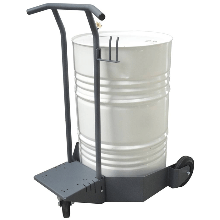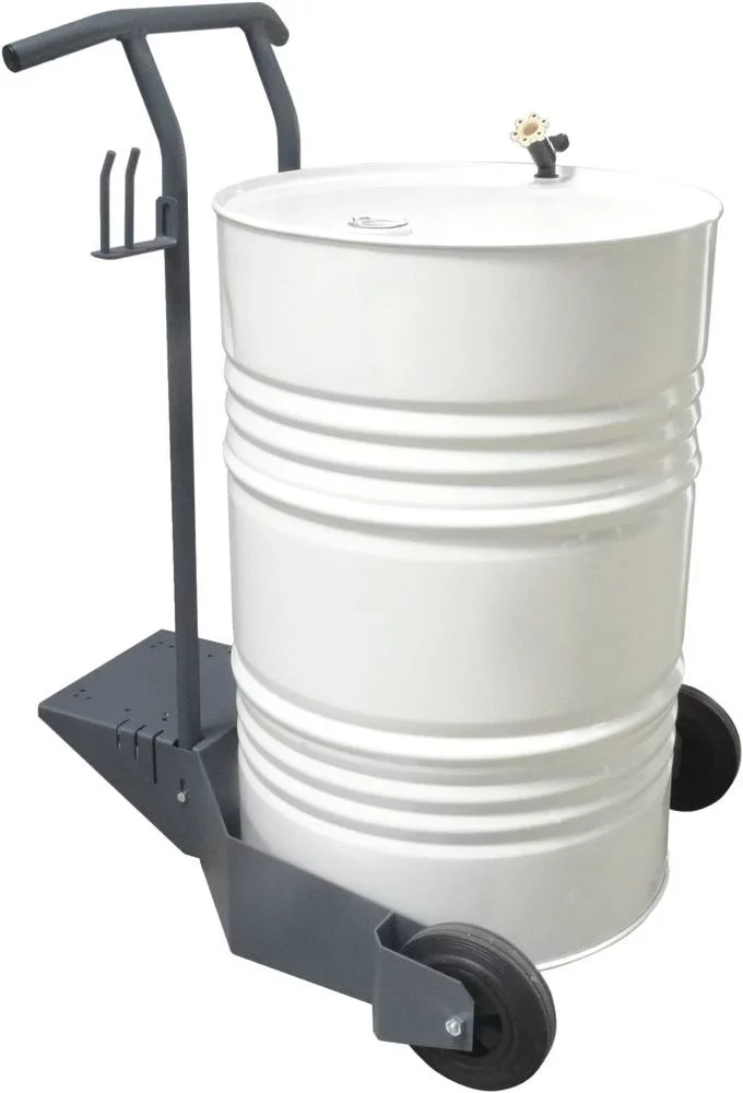 Chariot porte fûts DRAKKAR. Ce chariot est équipé de deux roues fixes, d’une roues pivotante pour pouvoir manœuvrer facilement, et d’un bras de guidage avec support de pistolet.