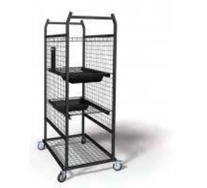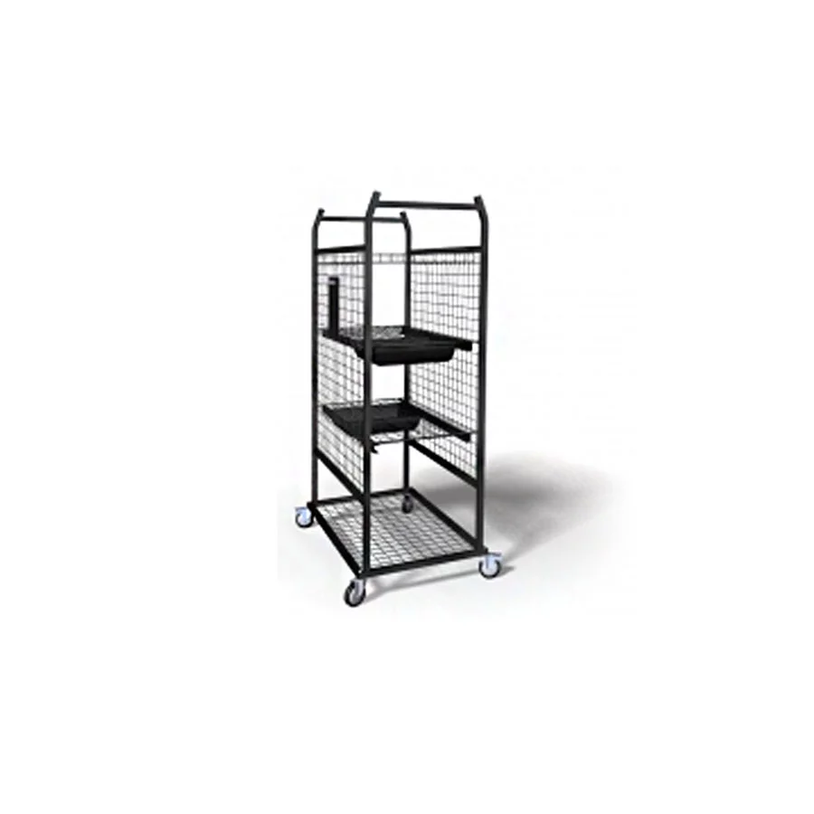 Composé de 2 plateaux en treillis métalliques (amovible en haut et fixe en bas). Roues Ø125 mm à bandage caoutchouc résistant aux hydrocarbures (2 fixes et 2 pivotantes à frein).