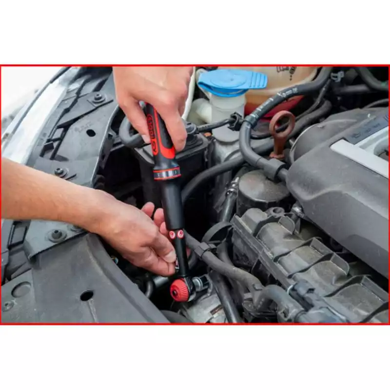 Clé dynamométrique 1/4 KS TOOLS Assure un serrage parfait. Évitant ainsi les risques de sur serrage ou de sous serrage, et garantissant la sécurité de vos assemblages. Lorsque le couple prédéfini est atteint, un signal sonore et tactile vous avertit. Permettant ainsi un travail efficace et sans effort.