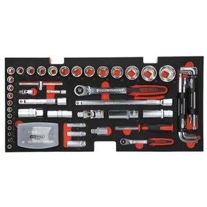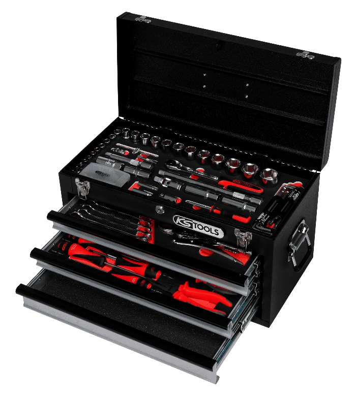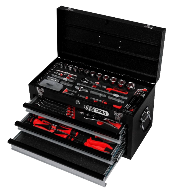 Caisse a outils métallique avec 114 pièces KSTOOLS, équipé de 3 tiroirs à ouverture totale sur glissières à roulement billes extra-résistant verrouillable à l’aide d’une clé, fermeture centralisée, plateaux en mousses préformées et poignée de transport. Garantie à vie ! (dans des conditions normales d’utilisations).