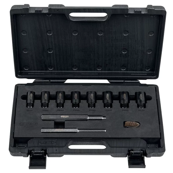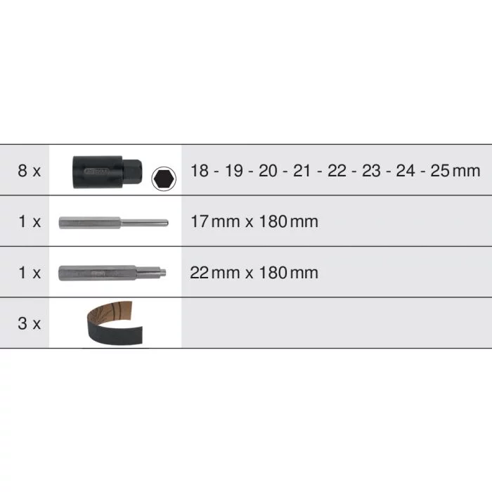Ce coffret comprend plusieurs douilles à chocs pour s’adapter à différents types d’écrous antivol. Les douilles disponibles vont de 19 mm à 25 mm, offrant ainsi une large gamme de tailles pour répondre à divers besoins. Il comprend également deux tiges 6 pans de 17 mm et 22 mm de longueur pour un démontage facile.