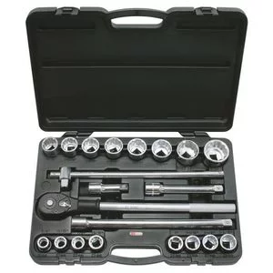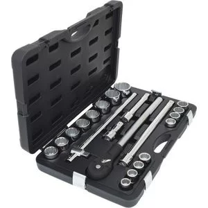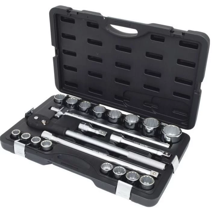 Coffret de douilles 12 pans en pouces et accessoires 3/4 21 pièces. Angle de reprise : 15°. Attribut de fonction 1 : Déverrouillage rapide Attribut de fonction 2 : Réversible Carré d’entraînement en pouce :3/4″. Dents : 24 dents Matière : Acier Chrome Vanadium extra-fin, satiné mat, chromé. Profil : 1 12 pans extérieur. Pièces dans le set : 21 pièces.