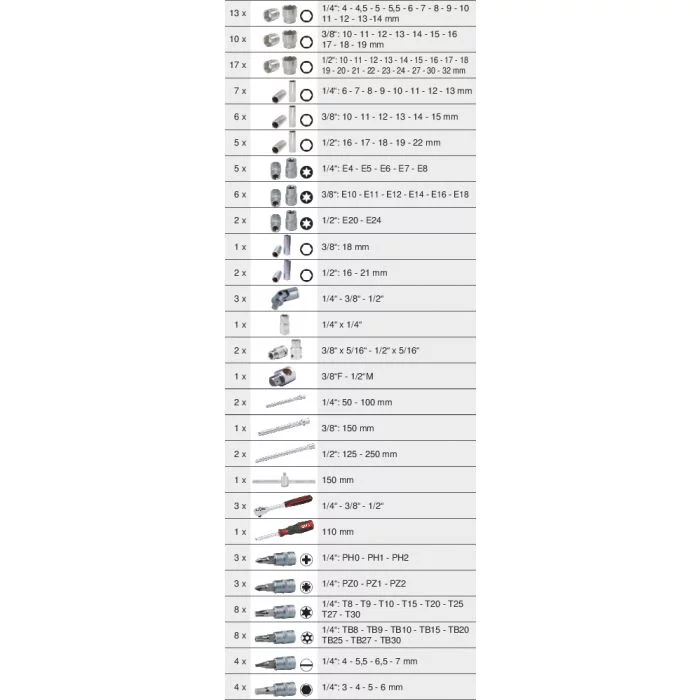 Ce coffret contient 195 pièces, comprenant des douilles variées, des rallonges, des adaptateurs et des cliquets, offrant une polyvalence optimale.