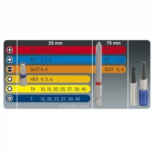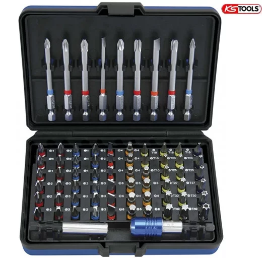 Jeu d’embouts de vissage à code couleur, coffret de 71 pièces KSTOOLS. Porte embouts magnétique 1/4’’ à verrouillage automatique, longueur 60 mm. Garantie à vie ! (dans des conditions normales d’utilisations). Composition du coffret : 1 x Porte embouts magnétique : 1/4’’ à verrouillage automatique, L. 60 mm 1 x Porte embouts magnétique : 1/4’’ 60 x Embouts : 1/4’’, L. 25 mm : 9 x 6 pans : 3 x 4,0 – 3 x 5,0 – 3 x 6,0 mm 6 x Fente : 3 x 4,0 – 3 x 6,0 mm 12 x PHILLIPS : 3 x PH1 – 6 x PH2 – 3 x PH3 12 x POZIDRIV : 3 x PZ1 – 6 x PZ2 – 3 x PZ3 14 x TORX : 3 x T10 – 2 x T15 – 2 x T20 – 2 x T25 – 2 x T30 – 2 x T40 6 x TORX percé : T15 – T20 – T25 – T27 – T30 – T40 9 x Embouts : 1/4’’, L. 75 mm : 2 x Fente : 4,0 – 6,0 mm 4 x PHILLIPS : 2 x PH2 – 2 x PH3 3 x POZIDRIV : 2 x PZ1 – 1 x PZ2