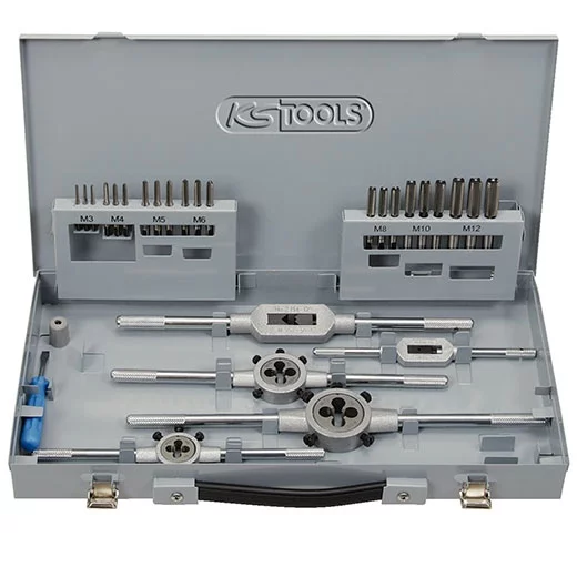 Coffret complet de jeux de tarauds, filières et forets, coffret avec plateau amovible. Jeux de 44 pièces KSTOOLS, permet de tarauder un orifice, créer un filetage sur une pièce. Garantie à vie ! (dans des conditions normales d’utilisations). Marque : KSTOOLS Coffret : 44 pièces 5 x Porte-filières 2 x Tournes à gauche 1 x Jauge à filetage métrique 1 x Tournevis fente 7 x Jeux de 3 tarauds : M3, M4, M5, M6, M8, M10, M12 7 x Filières : M3, M4, M5, M6, M8, M10, M12 7 x Forets HSS : 2,5 – 3,3 – 4,2 – 5,0 – 6,8 – 8,5 – 10,2 mm Plateau amovible Poids : 3,93 kg