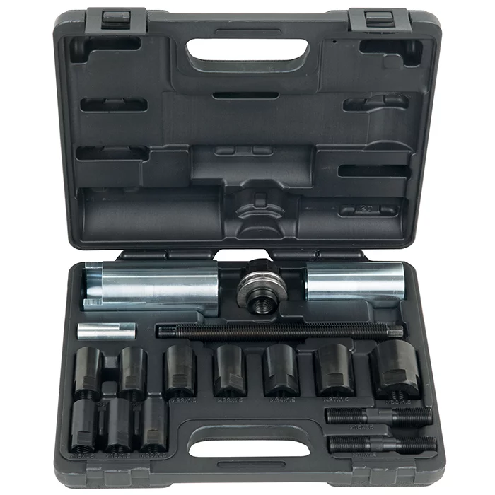 Coffret idéal pour insérer le cardan dans le moyeu de roue, Vis de force, 10 douille incluses, coffret de rangement. Utilisation : BMW, Mercedes, Porshe, Volkswagen, Audi Marque : KSTOOLS Coffret composé de 16 pièces : Douille, M18x1,5 mm Douille, M16x1,5 mm (Subaru) Douille, M20x1,5 mm (Porshe, Volkswagen) Douille, M22x1,5 mm (BMW E30, E46) Douille, M24x1,5 mm (BMW E34, Mercedes W203) Douille, M27x1,5 mm (BMW E32, E34, E39, E38, X5) Douille, M30x1,5 mm (BMW E34) Douille, M20x1,0 mm Douille, M20x1,25 mm Douille, M22x1,0 mm Vis de force avec écrou, M16x2,0 230 mm Boulon, M14x1,5 45 mm Douille, Ø39 mm, 80 mm Douille, Ø49,9 mm, 110 mm Vis, M14x1,5, 80 mm Vis, M16x1,5, 80 mm Poids : 3,02 Kg