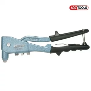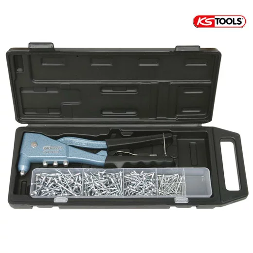 Coffret de pince à rivets + assortiment de rivets KSTOOLS. Embouts et clé intégrés au corps de pince. Livrée avec 200 rivets et une pince à rivets avec une poignées en caoutchouc.