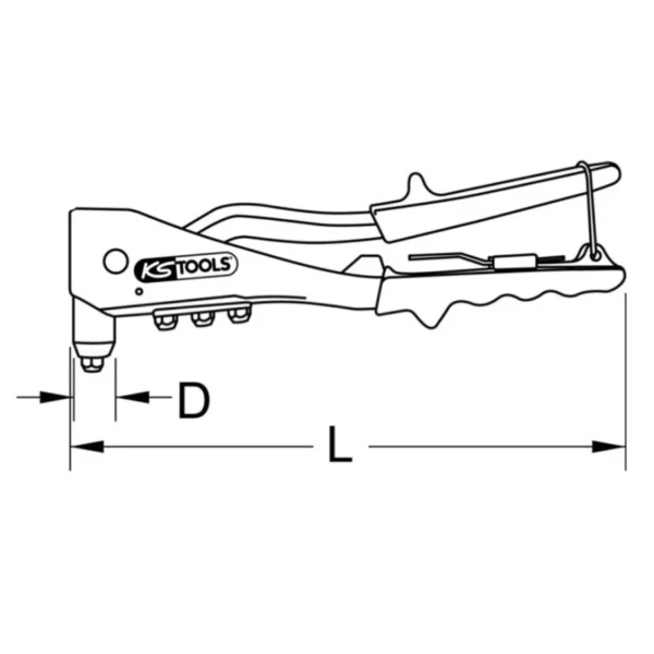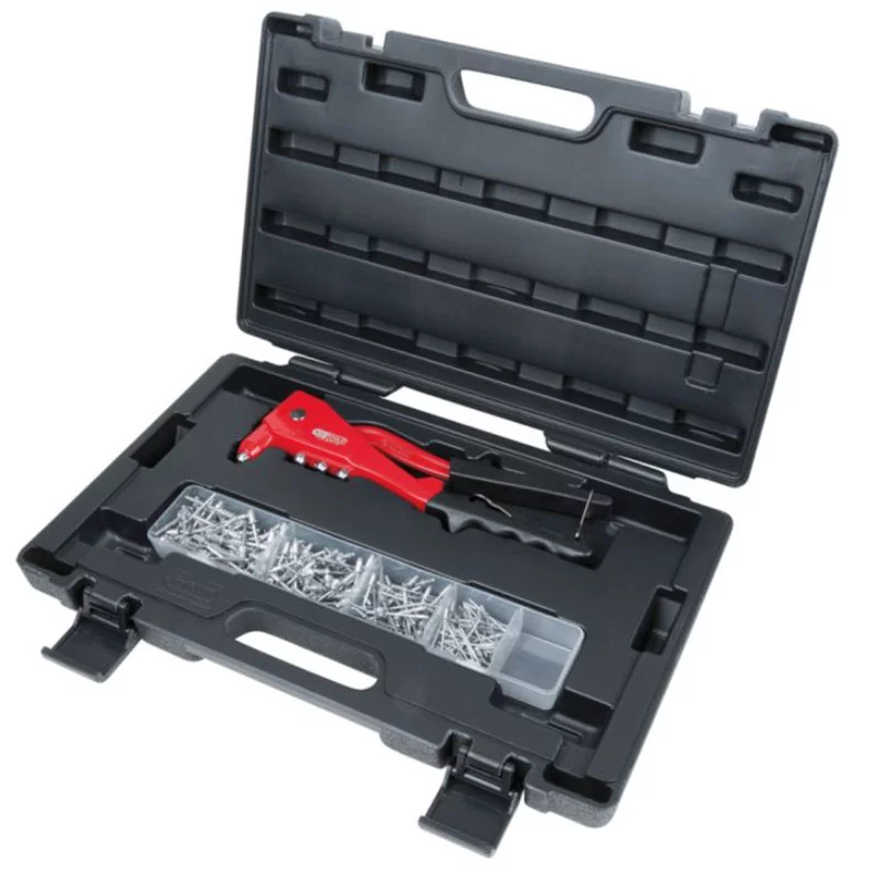 Coffret de pince à rivets + assortiment de rivets KSTOOLS. Embouts et clé intégrés au corps de pince. Livrée avec 200 rivets et une pince à rivets avec une poignées en caoutchouc.