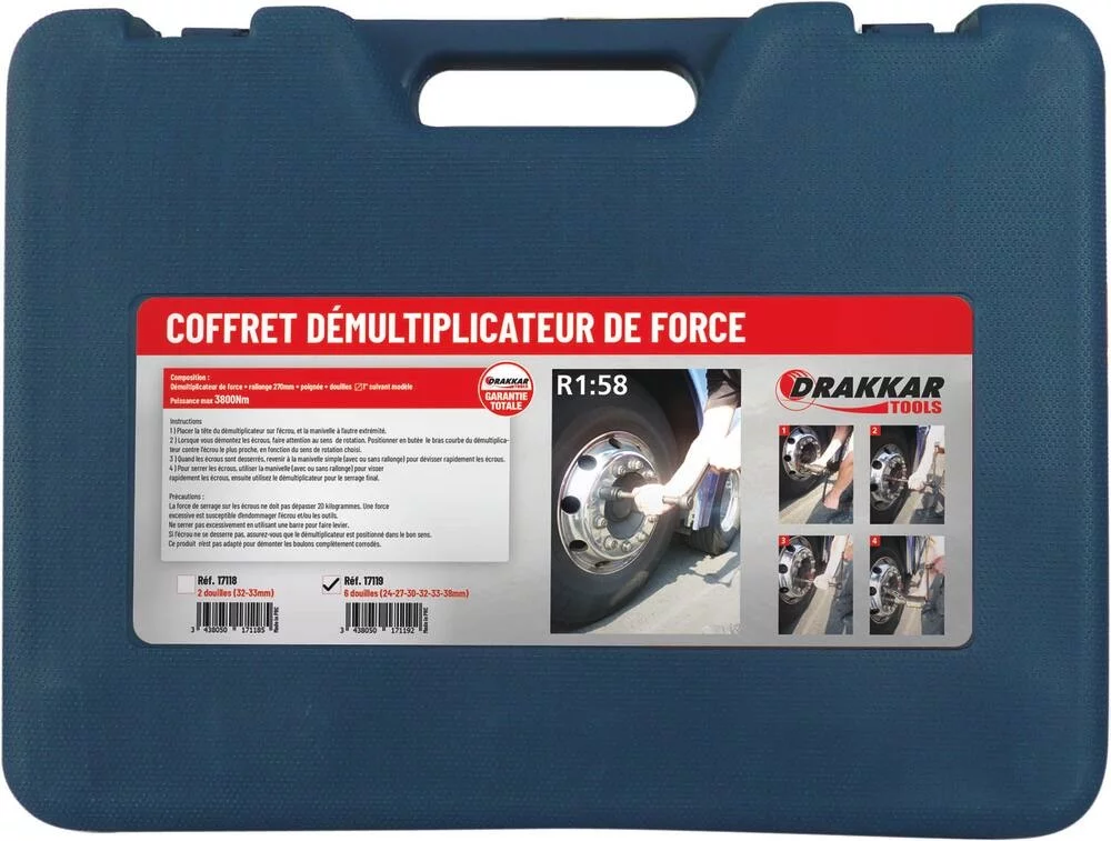 Coffret démultiplicateur de force 3800Nm R1:58 DRAKKAR est l’outil idéal pour desserrer les écrous les plus récalcitrants. Grâce à sa conception robuste et à son rapport de démultiplication élevé, il permet d’augmenter la force sans effort. Ainsi, même les écrous rouillés ou bloqués cèdent rapidement.