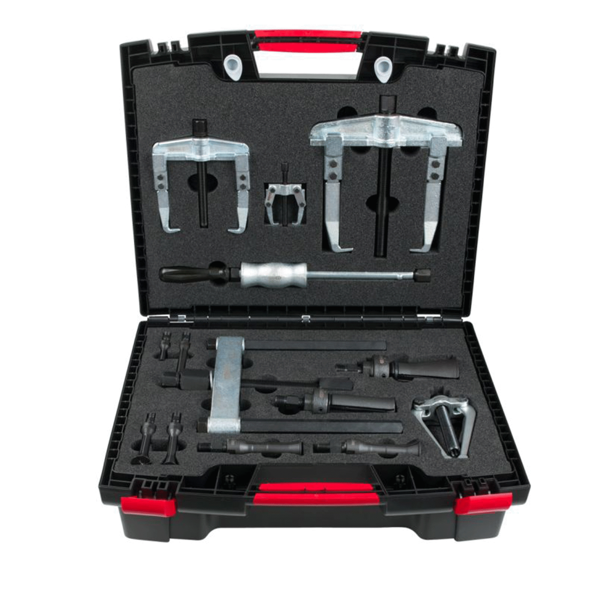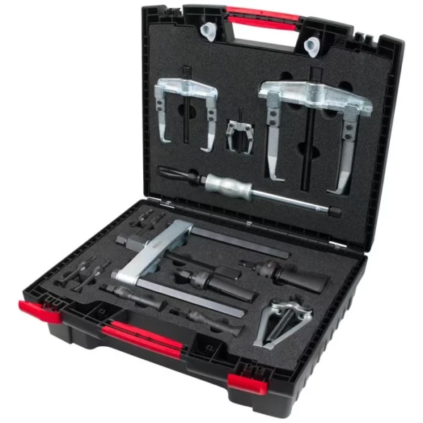 La puissance pluie incluse garantit une fixation solide et stable pendant l’utilisation. Ce coffret contient également des extracteurs universels à deux griffes articulées, comprenant des plages de 20-90 mm et de 50-60 mm, ainsi que des extracteurs pour cosses de batterie. Les vis hydrauliques renforcées assurent un effort de traction optimal sans risque d’usure prématurée.