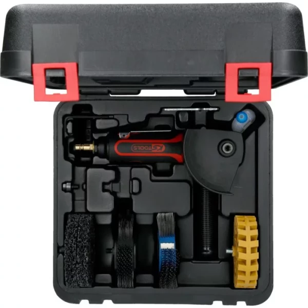 Coffret d’outil pneumatique multi-usage pour retirer la rouille, la peinture, le goudron et les adhésifs. Vibration atténuée, poignée Soft Grip, vitesse réglable. Livré avec raccord rapide 1/4 » et coffret robuste.