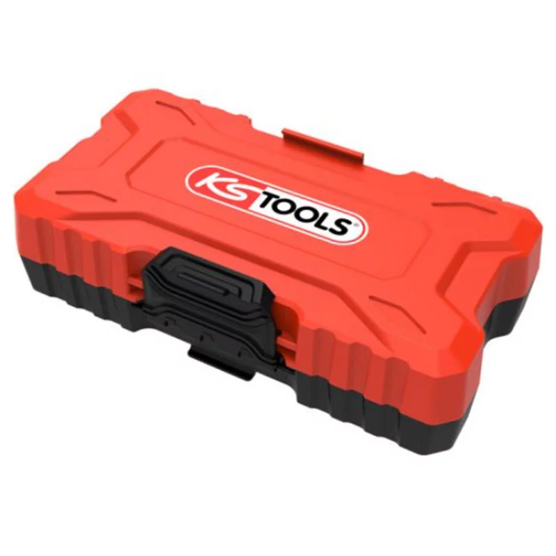 Coffret d’emboit de vissage à chocs 1/4″ KS TOOLS. Ces embouts ultra résistants avec double zone de torsion pour un transfert de couple optimal on un traitement spécifique pour une utilisation à chocs.