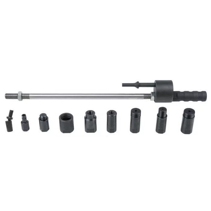 Coffret d’extracteurs d’injecteurs pour une utilisation avec burineur pneumatique et mandrin de 10 mm. Permet un retrait rapide et sans effort des injecteurs diesel même grippés, équippé d’un cardan permettant de centrer la force de traction et de conserver l’alignement de l’injecteur, et limité le risque de casse. Filetage de l’extracteur d’injecteurs 5/16″ x 16 mm Utilisation : Bosch, Delphi, Denso, Siemens, BMW, Ford, Kia, Renault, PSA, Fiat, Mercedes et anciens injecteurs haute pression Pièces dans le set : 10 pièces Poids : 1,30 kg