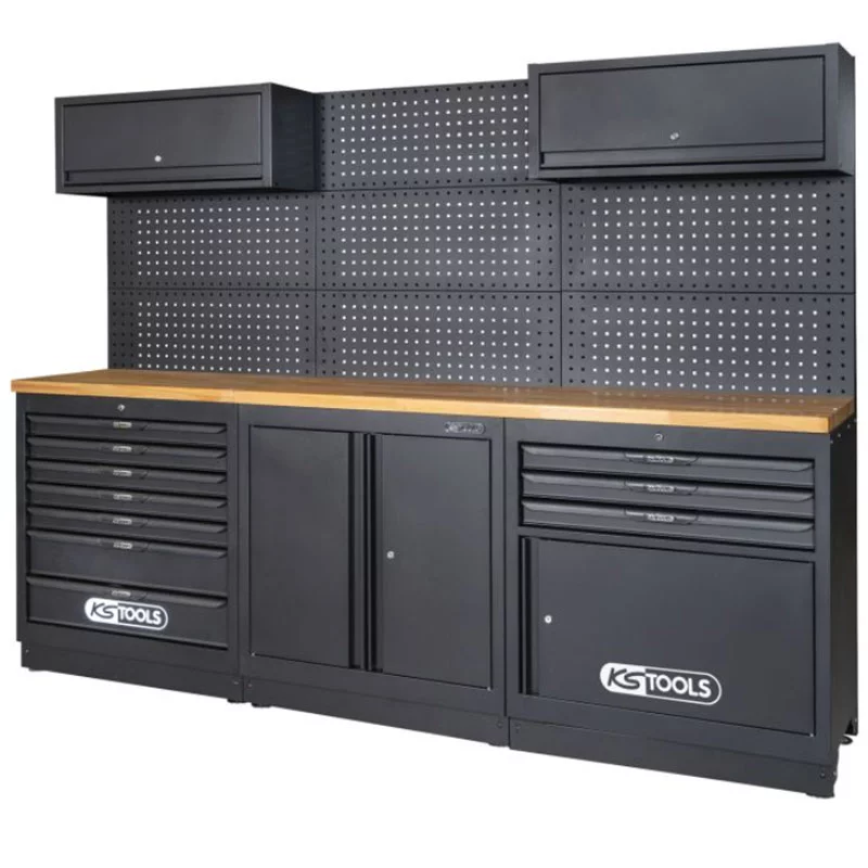 Composition de meubles d’atelier SRM 2,6 mètres KS TOOLS. Ce module est équipé de perforations normalisées pour fixation d’accessoires, d’un système de fermeture avec serrure, d’un plan de travail en bois, et de pieds réglables.
