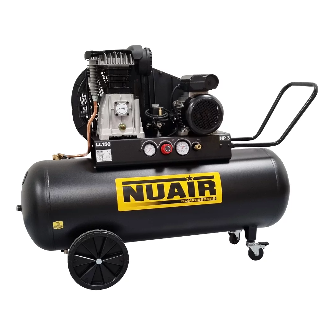 Compresseur d’air à piston NUAIR. Ce compresseur est équipé d’une grande poignée et de grandes roues pour faciliter le transport. L’instrumentation est protégée et intégrée au réservoir.