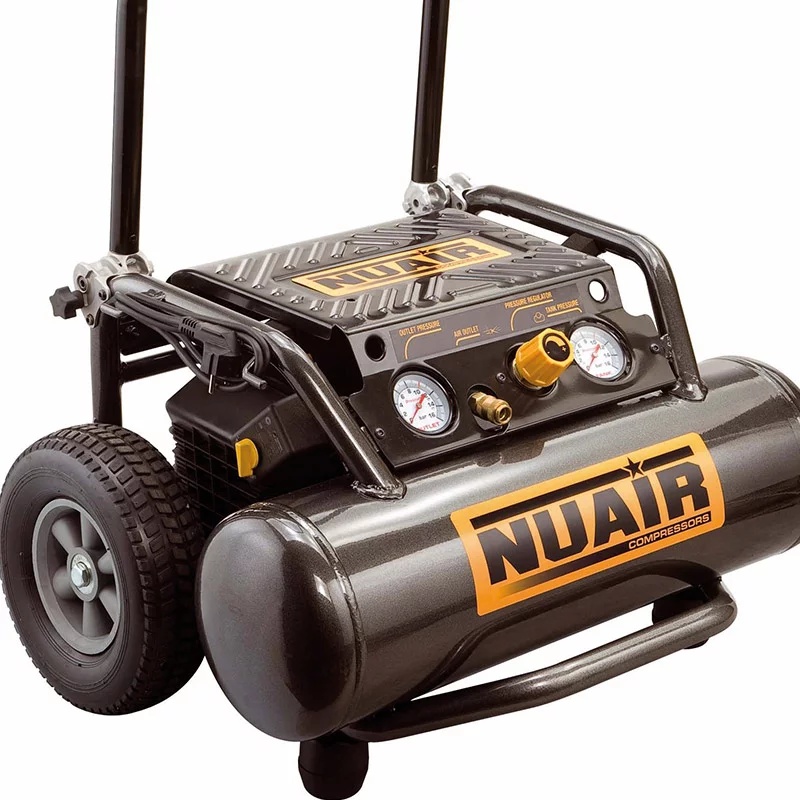 Compresseur NUAIR équipé de roues surdimensionnées. Dispose d’un faible encombrement.