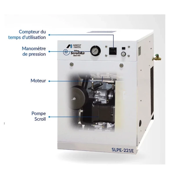 Compresseur d’air à spirale sans huile, certifier Classe zéro (ISO8573-1:2010) indique que l’huile à écoulement sur parois, la brume d’huile et la vapeur d’eau sont totalement inexistantes. Ce compresseur d’air peut-être utiliser 10 000 heures sans entretien.