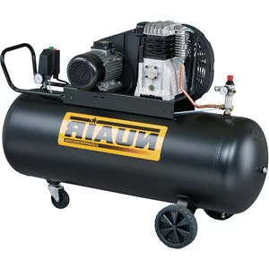 Compresseur d’air à piston NUAIR avec réservoir de 200 litres et moteur de 3 CV triphasé. Compresseur à entrainement par courroie professionnel, monté sur roues.