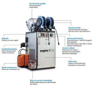 Le concept « bi-énergie » regroupe en un seul appareil autonome, une centrale d’air comprimé et une génératrice de courant électrique en monophasé 230V et triphasé 400V. Il est particulièrement bien adapté pour l’équipement des camions ateliers poids lourds et véhicules légers.