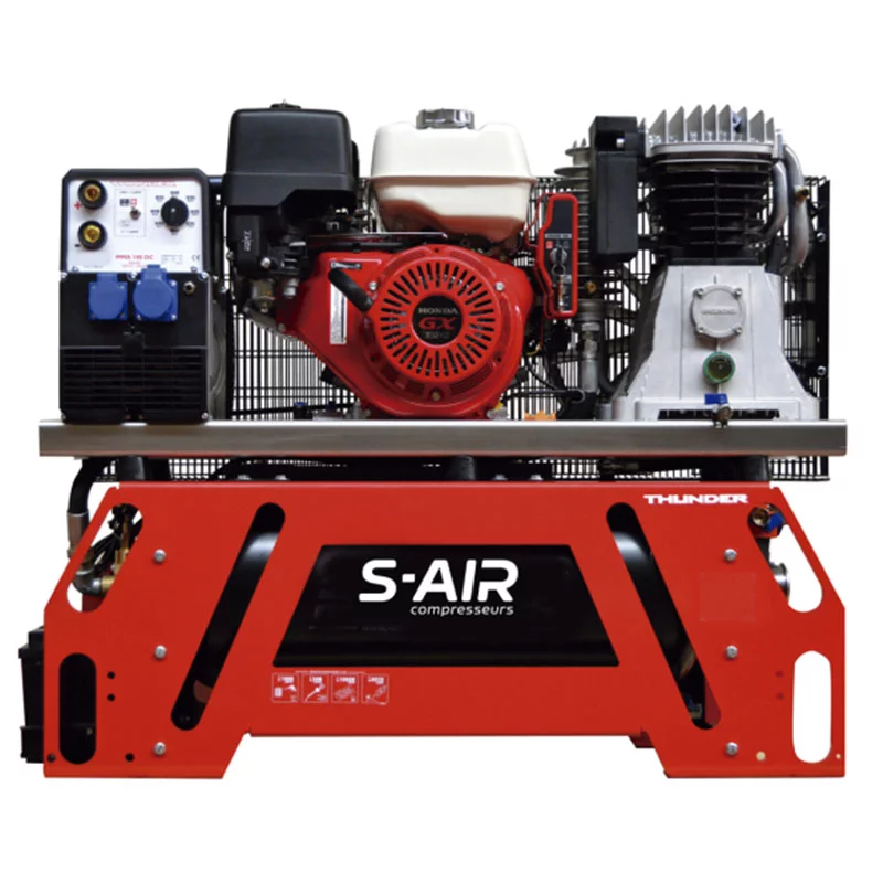 Compresseur thermique moteur essence 13 CV démarrage électrique sur réservoir 50 L 14,5b et tête de compression BK119 avec génératrice 3,5 kVA monophasée et 180 A MMA, fourni avec batterie.