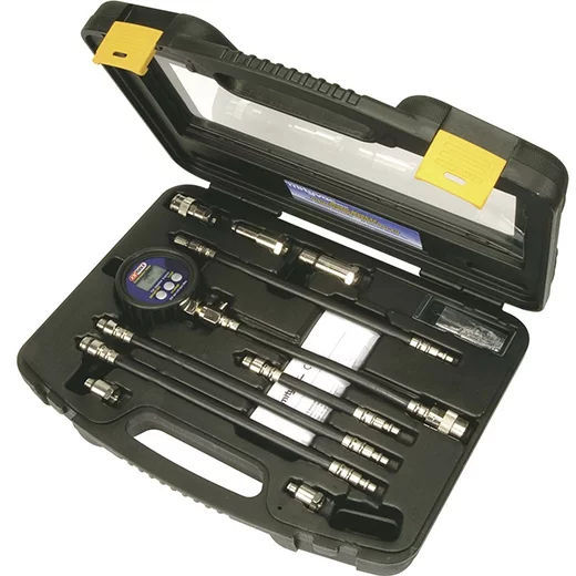 Compressiomètre et testeur d’étanchéité de cylindre KSTOOLS® Essence 10 pièces. Assortiment complet d’adaptateurs M10 – M12 – M14 – M16 – M18 convenant à la plupart des véhicules et petits moteurs industriels Adaptateur à maintien de pression pneumatique pour réparations des joints de soupape sans démontage de la culasse Manomètre digital pour lecture des Psi, Bar et Kpa de 0-20 Bars Manomètre analogique 0 – 200 PSI Mémoire 18 cylindres Livré avec piles Poids 2,20 kg