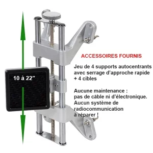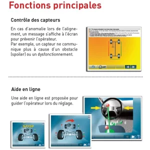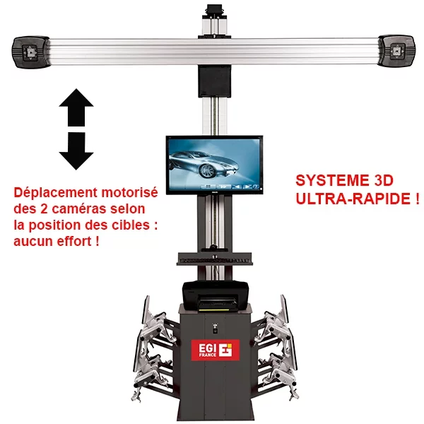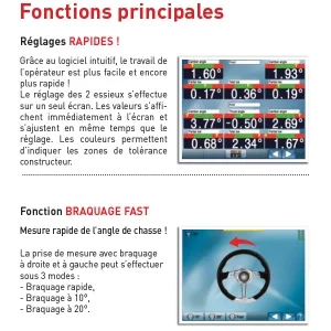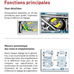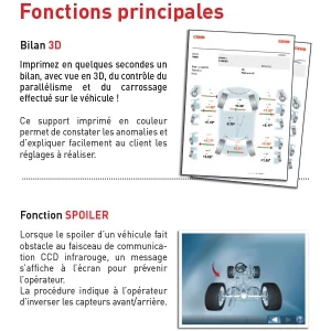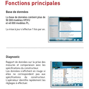 Controleur de géométrie 2 caméras 3D pour VL, VUL et PL. Déplacement motorisé des 2 caméras selon la position des cibles. > 4 cibles sans composants électroniques ! En cas de choc, aucun composant à remplacer ou à calibrer. > Reconnaissance de la position des cibles dans l’espace. > Mesure précise Haute Définition ! Chaque caméra analyse 2 cibles en même temps. > Mesure automatique des voies, des empattements et de la différence d’axe avant chaque contrôle de géométrie pour détecter toute anomalie mécanique ou de carrosserie. > DST TECHNOLOGIE : Gain de temps ! Il n’est pas nécessaire d’arrêter le système windows avant d’éteindre ! > Logiciel intuitif : Travail rapide et simplifié ! Fonction Braquage FAST, Visualisation détaillée des réglages, Bilan Vue 3D. Fonctions principales: > Réglages RAPIDES > Bilan 3D > Fonction BRAQUAGE FAST La prise de mesure avec braquage à droite et à gauche peut s’effectuer sous 3 modes > Fonction SPOILER > Vues détaillées en 3D > Base de données 50 000 modèles VP/VU et 40 000 modèles PL. > Mesure automatique des voies et empattements > Diagnostic L’opérateur identifie rapidement les réglages à effectuer. > Contrôle des capteurs > Aide en ligne > Mise à jour des données (1 fois par an). Marque: CEMB Système de mesure 2 caméras 3D Communication optique Système d’exploitation Windows Ecran 22” 4 têtes aucun composant Mise à jour USB DST Technologie intégrée Accessoires Fournis: • Meuble / Ecran / Imprimante couleurs Logiciel de base de données VP/VU Logiciel de base de données VP/VU/PL • Jeu de 4 supports autocentrants (10” à 22”) avec serrage d’approche rapide + 4 cibles + jeu de 16 becs en métal • Bloque-volant + Presse-pédale • Plateau pivotant VP/VU