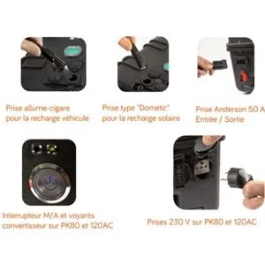 Connectiques : 2 prises 230 V / 1 Anderson 50 A – Sortie 12 V / 2 x USB double (USB3 + USB C)