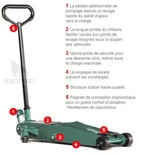 Capacité de levage 4 tonnes, équipé d’un dispositif de descente « levage et blocage » empêchant toute descente intempestive, d’une pédale additionnelle de pompage assure un levage rapide du sabot vers la charge, d’une vanne pilote de sécurité pour une descente sure, même en charge maximale.