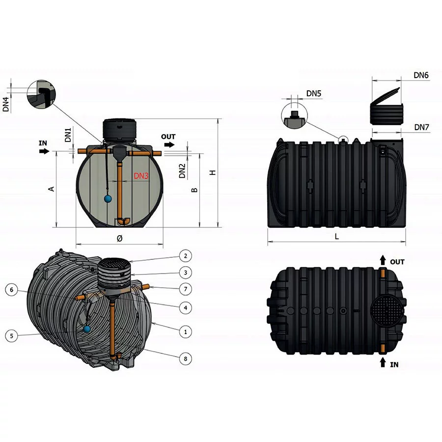 L’eau de pluie pénètre dans l’espace de filtration à la descente de la gouttière. Les débris sont retenu par le système de filtre par grille et évacué vers la cuve. -L’eau filtrée pénètre dans la cuve de stockage par gravité via un système de décantage.