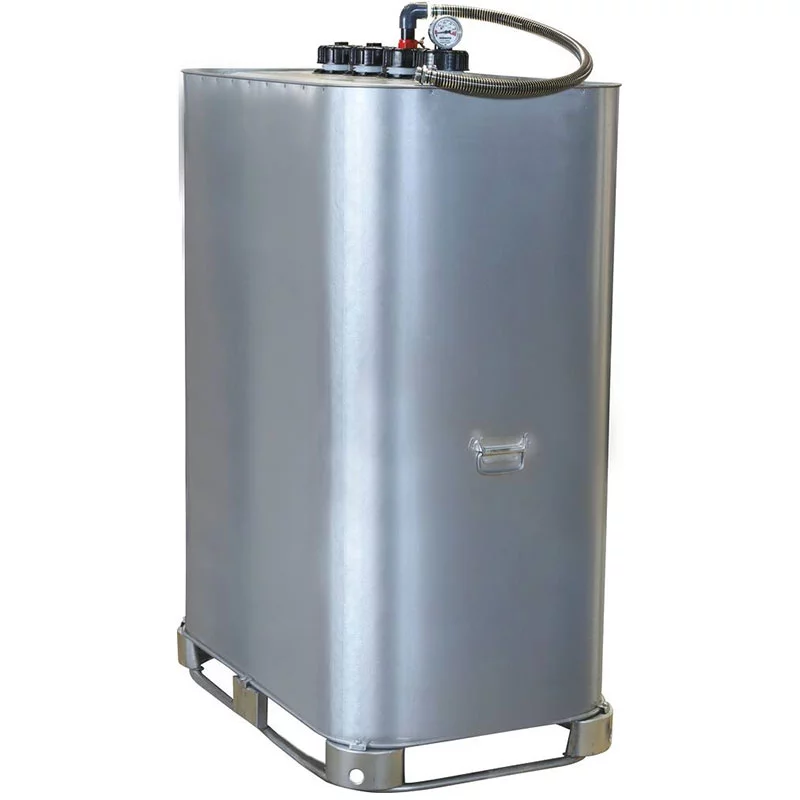 Pour le stockage du gasoil, du fuel et du GNR, Galvanisée – Double paroi., Cuve conforme aux normes internationales UN/ADR pour des produits classés dangereux (groupes d’emballages II et III). Pour un stockage en intérieur. Cuve livrée avec un détecteur de fuite, une jauge et un évent.