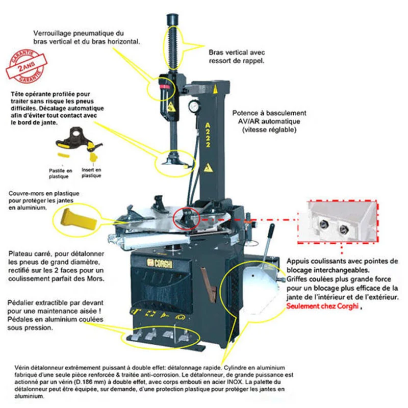 Démonte-pneu intensif automatique avec potence basculante pour jantes jusqu’à 22″ CORGHI.