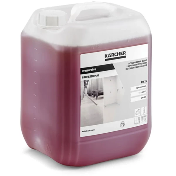 Détergent acide concentré en bidon de 10 litres, pour nettoyage haute pression. Élimine les dépôts de calcaire, rouille, tartre et graisse.